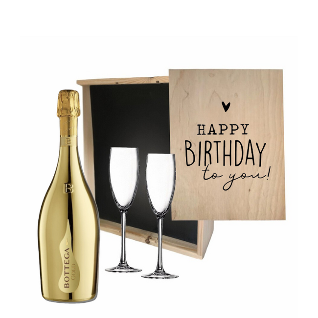 Bottega Gold in een luxe geschenkkist met twee schitterende glazen én jouw eigen bedrukking. Kies uit Gold of Rosé en maak er een stijlvol en persoonlijk verjaardagscadeau van. Perfect om iemand feestelijk te feliciteren. Lees meer.