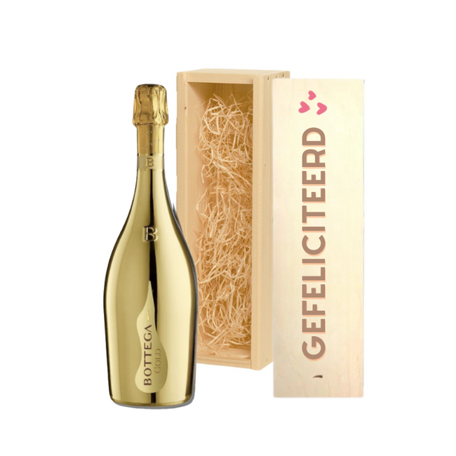 Ben je op zoek naar een bijzonder en persoonlijk verjaardagscadeau? Met de Bottega Gold in een gepersonaliseerde houten geschenkkist geef je een cadeau dat luxe, feestelijk en persoonlijk is. De stijlvolle fles Bottega wordt geleverd in een prachtige houten kist die je volledig kunt laten bedrukken met jouw eigen tekst of ontwerp.