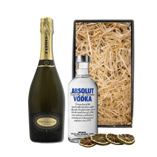 In dit sensationele pakket vind je een 75cl fles Toso Millesimato Prosecco Spumante, 35cl Absolut Vodka en zes zorgvuldig zelfgedroogde citroenschijfjes. Een perfecte combinatie van ingrediënten die de Scroppino, een klassieke Italiaanse cocktail, tot leven brengt.
