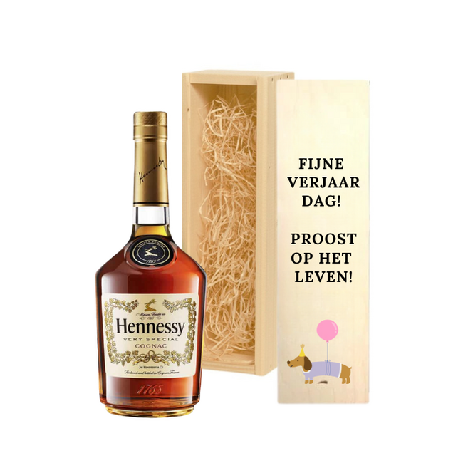 In de kist bevindt zich een fles Hennessy Cognac, een van de meest toonaangevende namen binnen de wereld van premium cognac. Hennessy staat bekend om zijn rijke erfgoed, vakmanschap en karakteristieke smaakprofiel. Daarmee vormt deze kist een stijlvol en tijdloos cadeau voor familie, vrienden, collega’s of iemand die een bijzondere verjaardag viert.